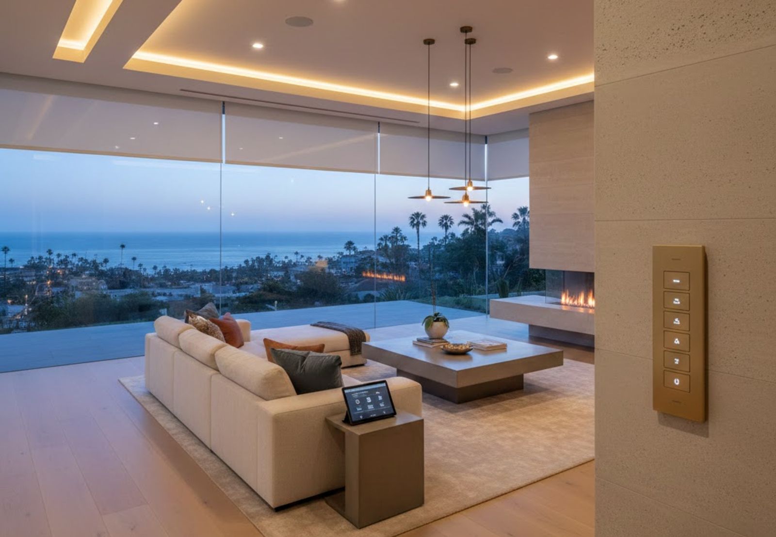 - Newport Coast estates with hidden motorized shades, warm dimmable lighting, and ocean-view protection